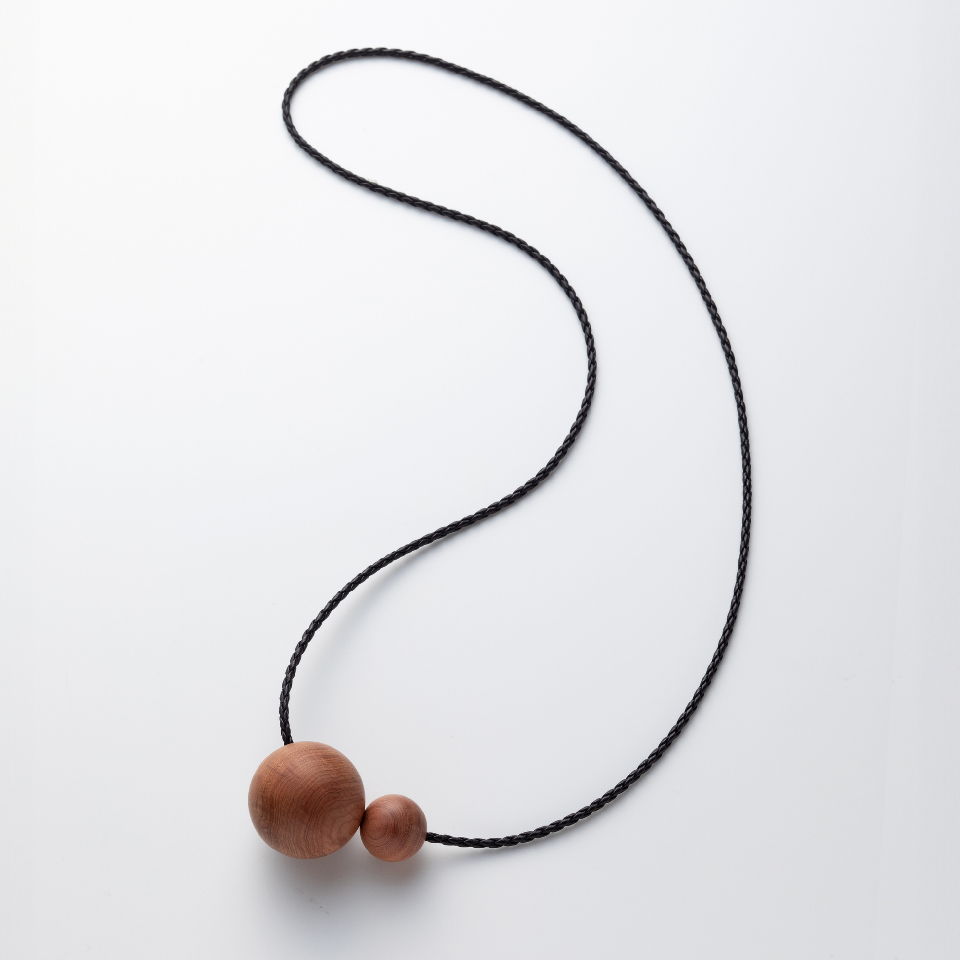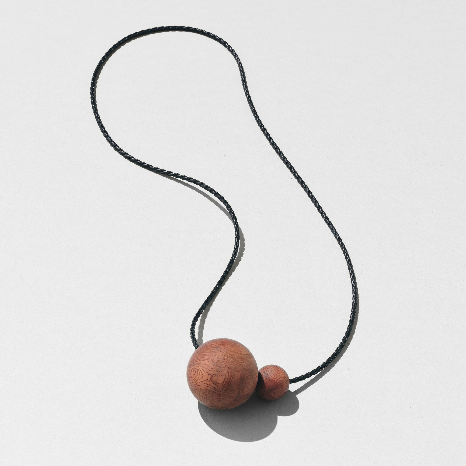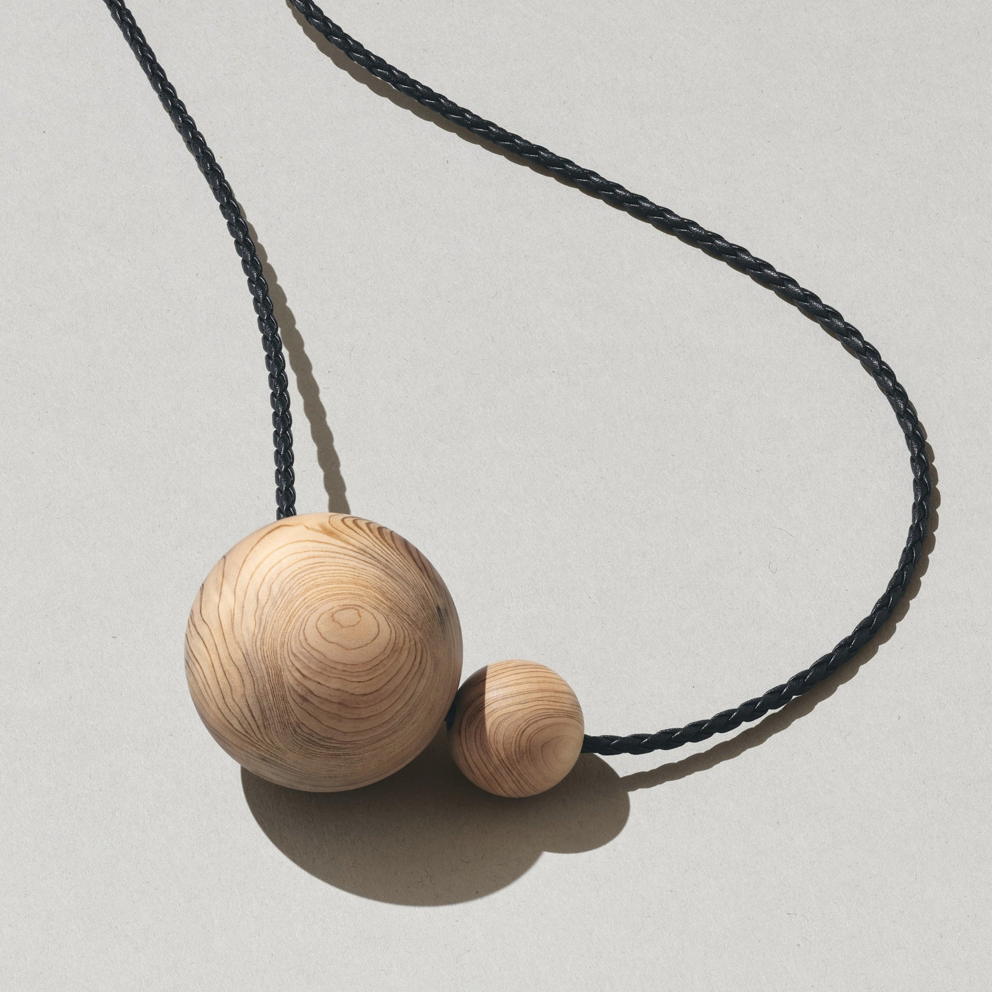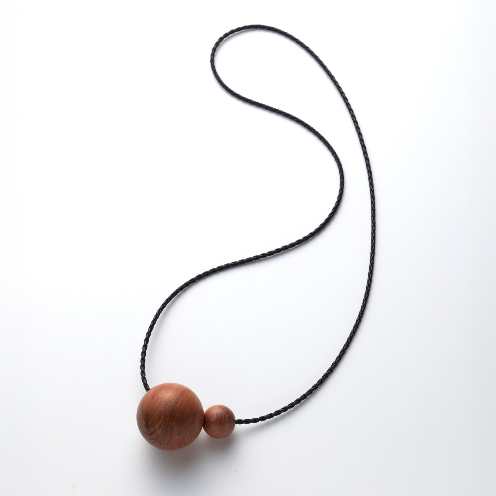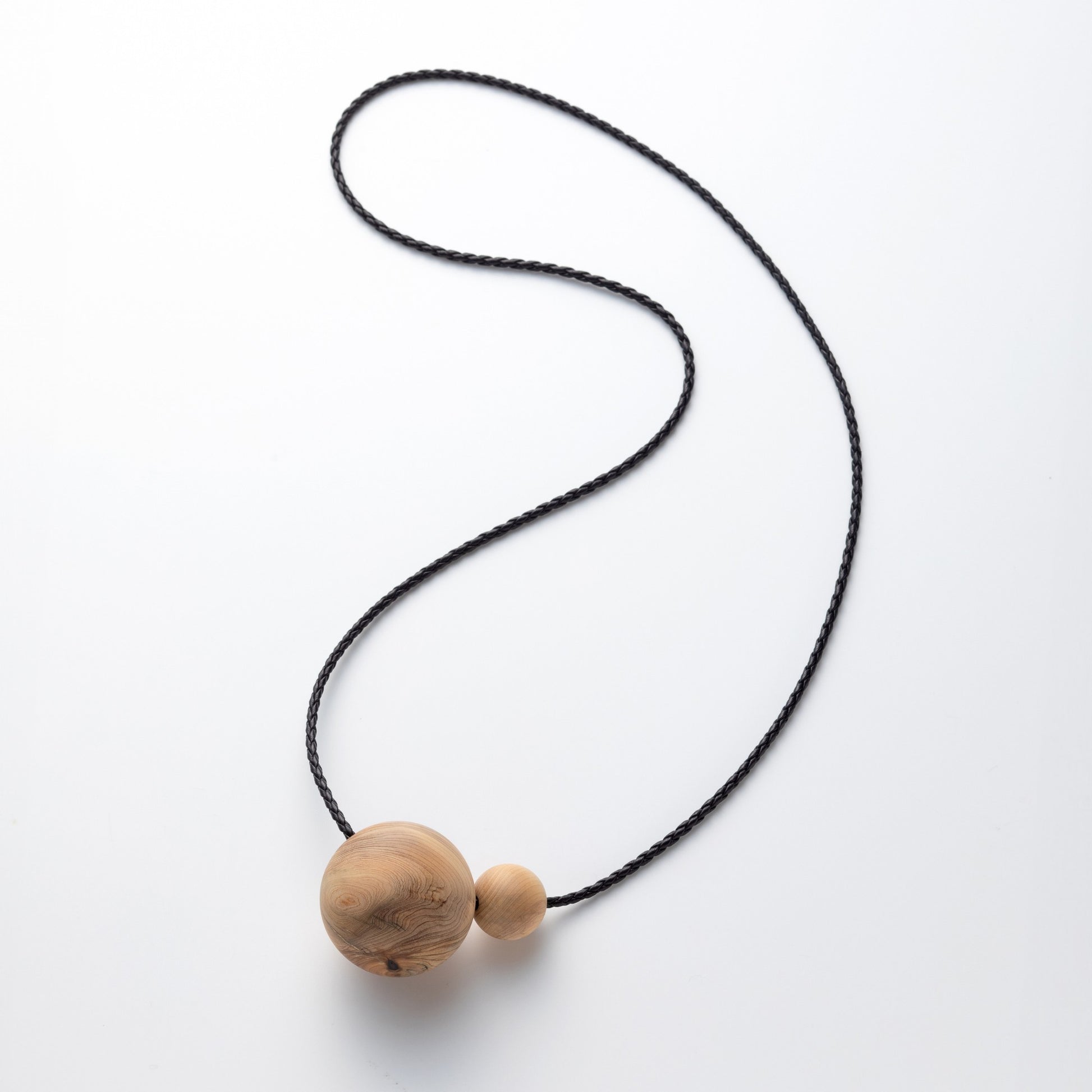 初作では、一位、杜松、蝦夷松の3樹種を端正な玉に挽き、ネックレスに仕立てました。丸く削りだすことで、内から現れる全ての年輪を途切れなく辿り、盆栽の生命をあまねく映しだそうと試みました。
