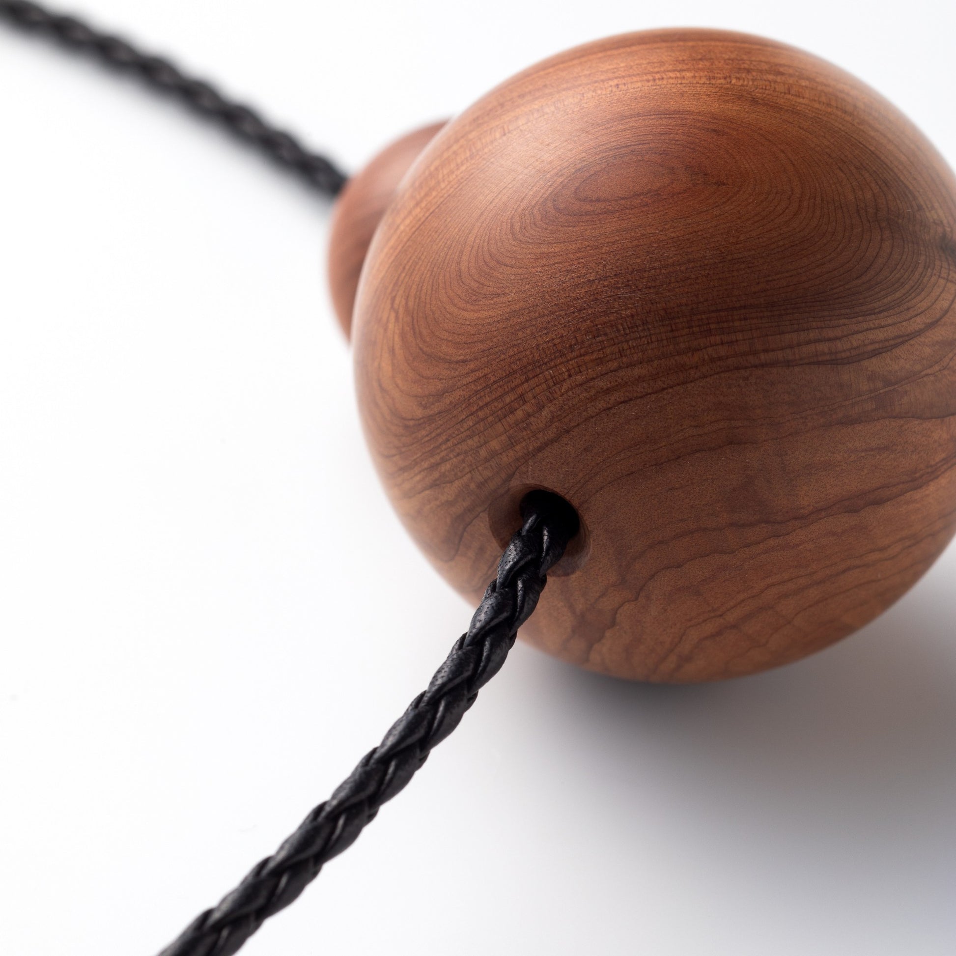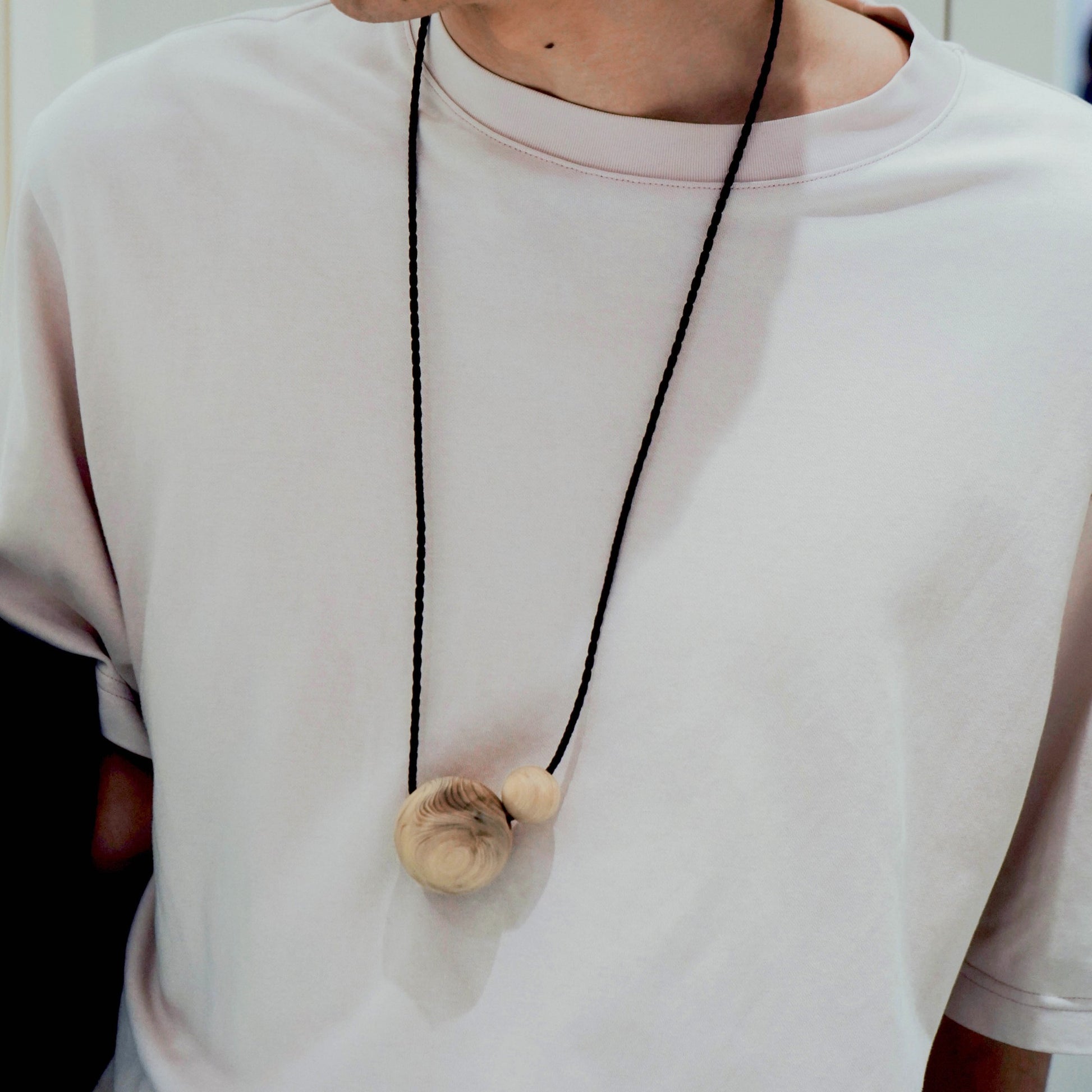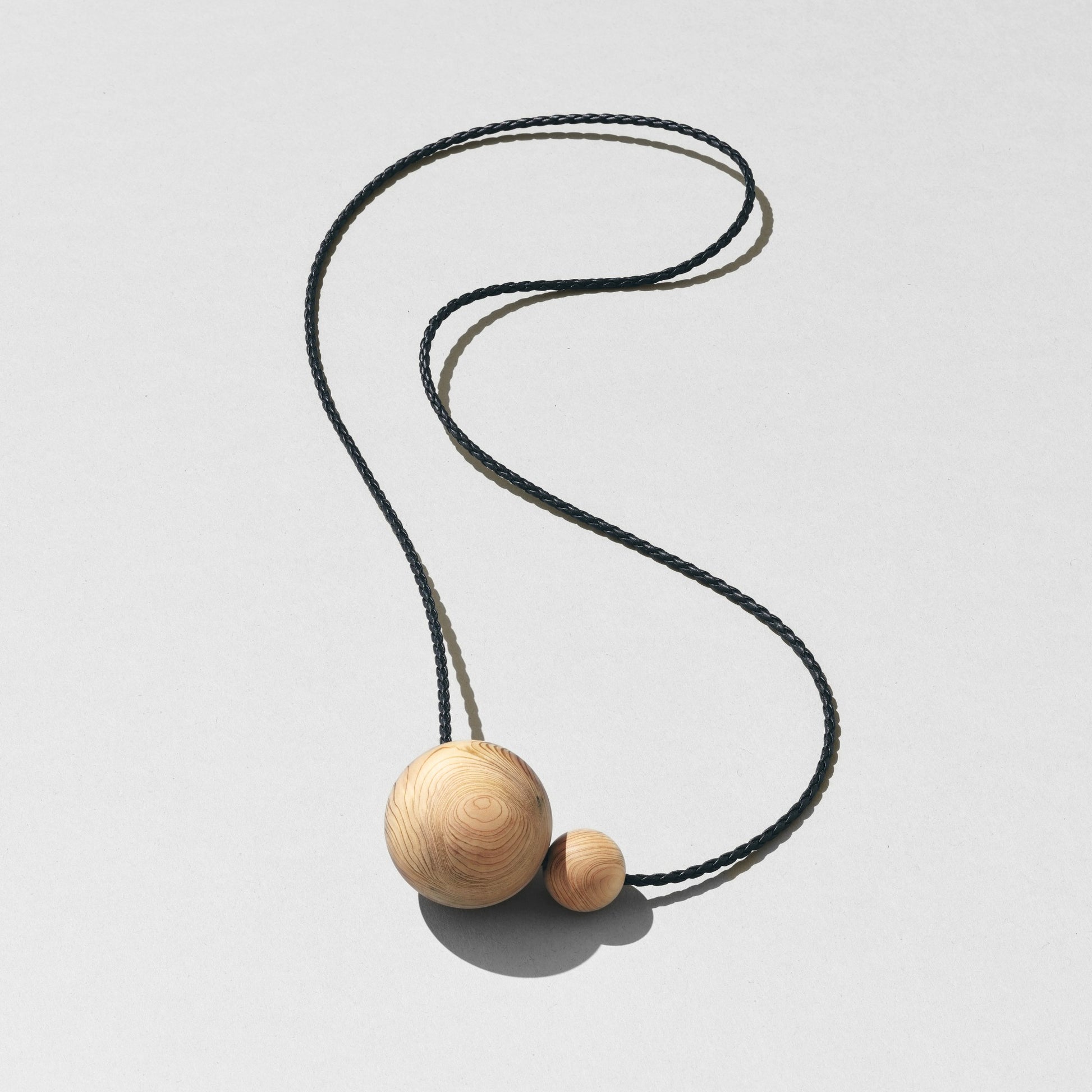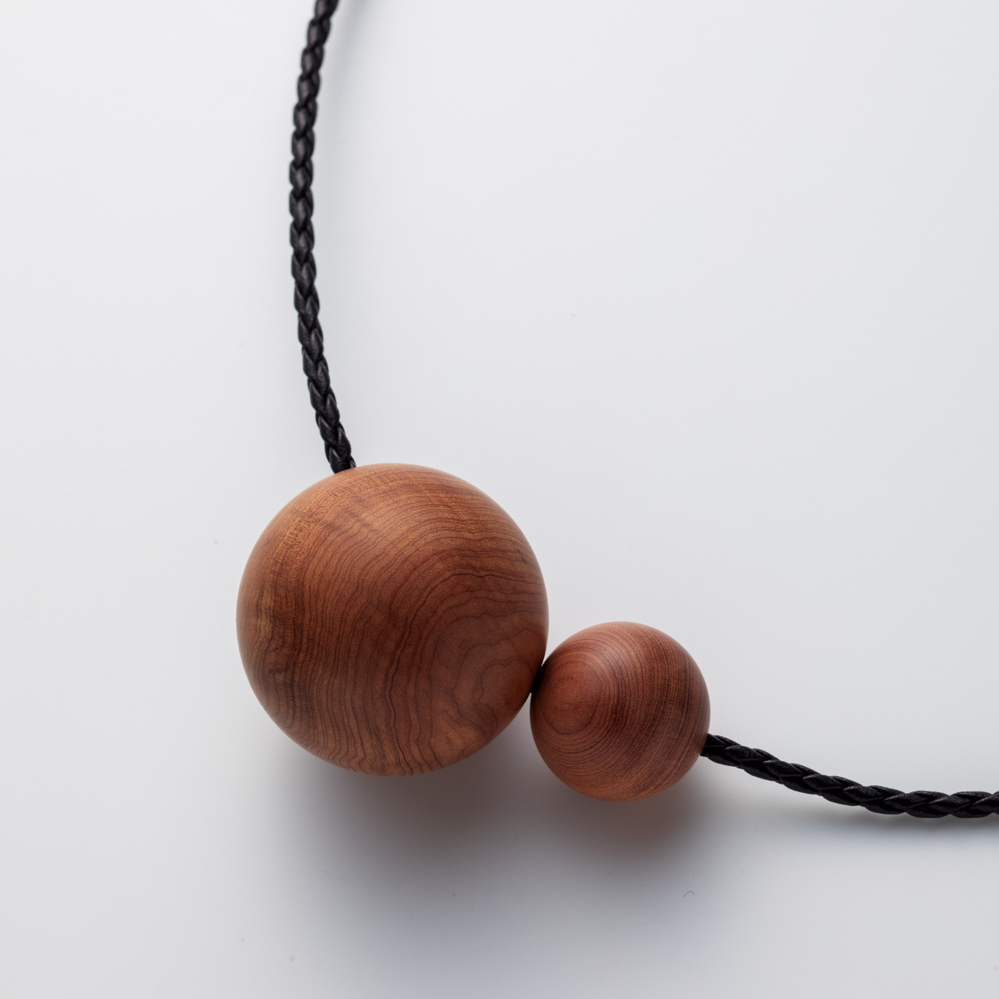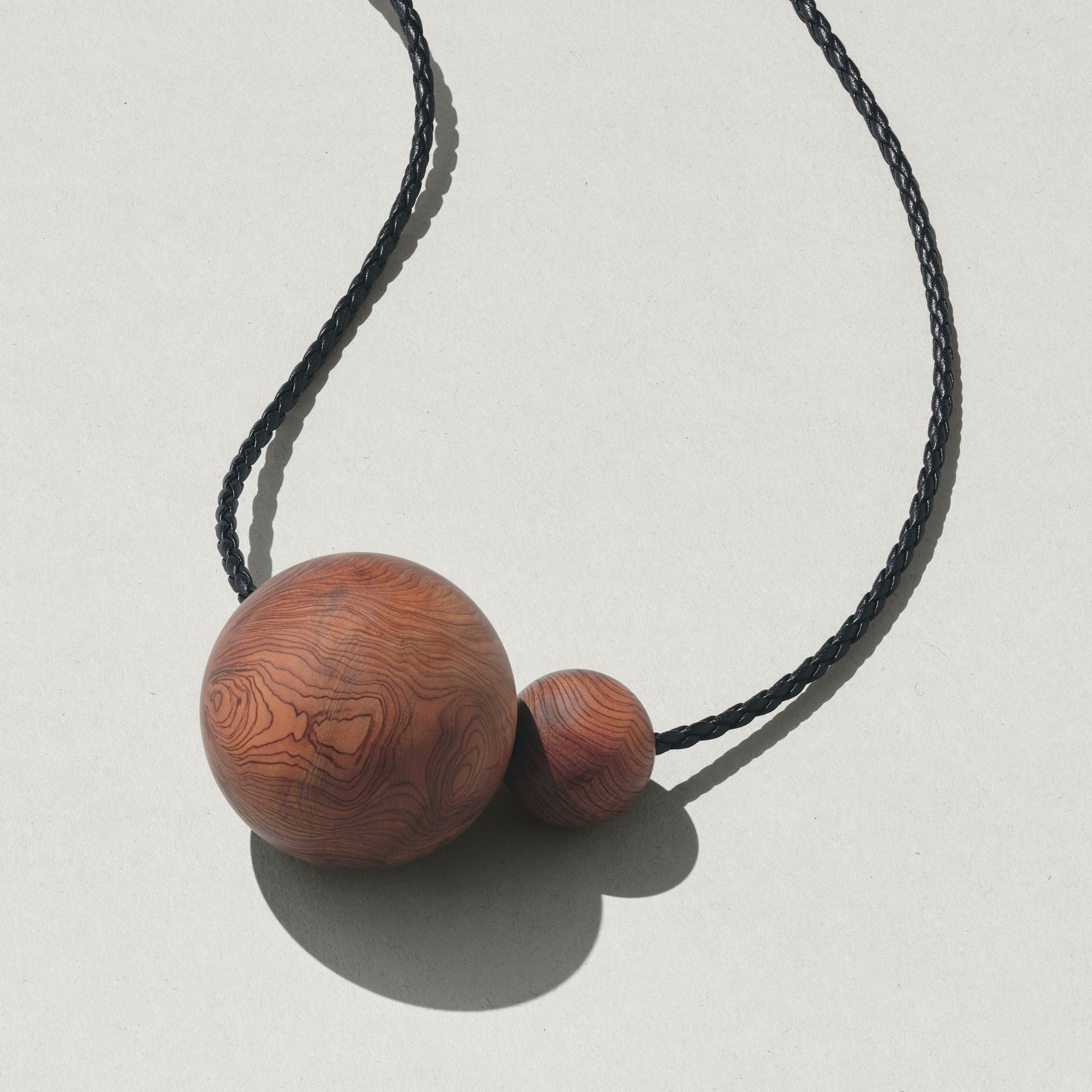 初作では、一位、杜松、蝦夷松の3樹種を端正な玉に挽き、ネックレスに仕立てました。丸く削りだすことで、内から現れる全ての年輪を途切れなく辿り、盆栽の生命をあまねく映しだそうと試みました。
