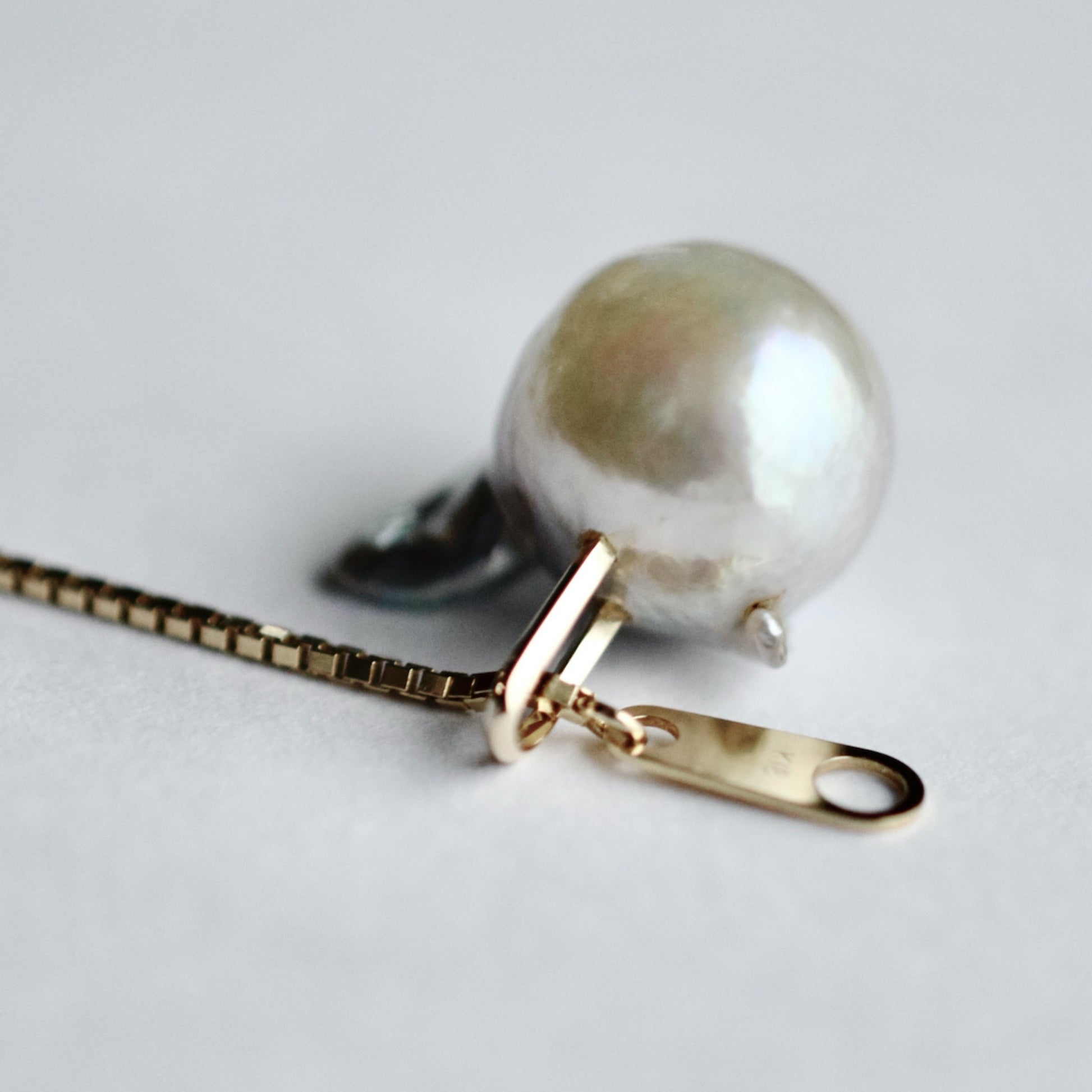 大粒のあこや真珠のペンダントチャーム。長崎五島に浮かぶ国境の島で天然採苗された母貝に抱かれたあこや真珠は、11ミリを超える大粒で、内から滲むような美しさに満ちています。