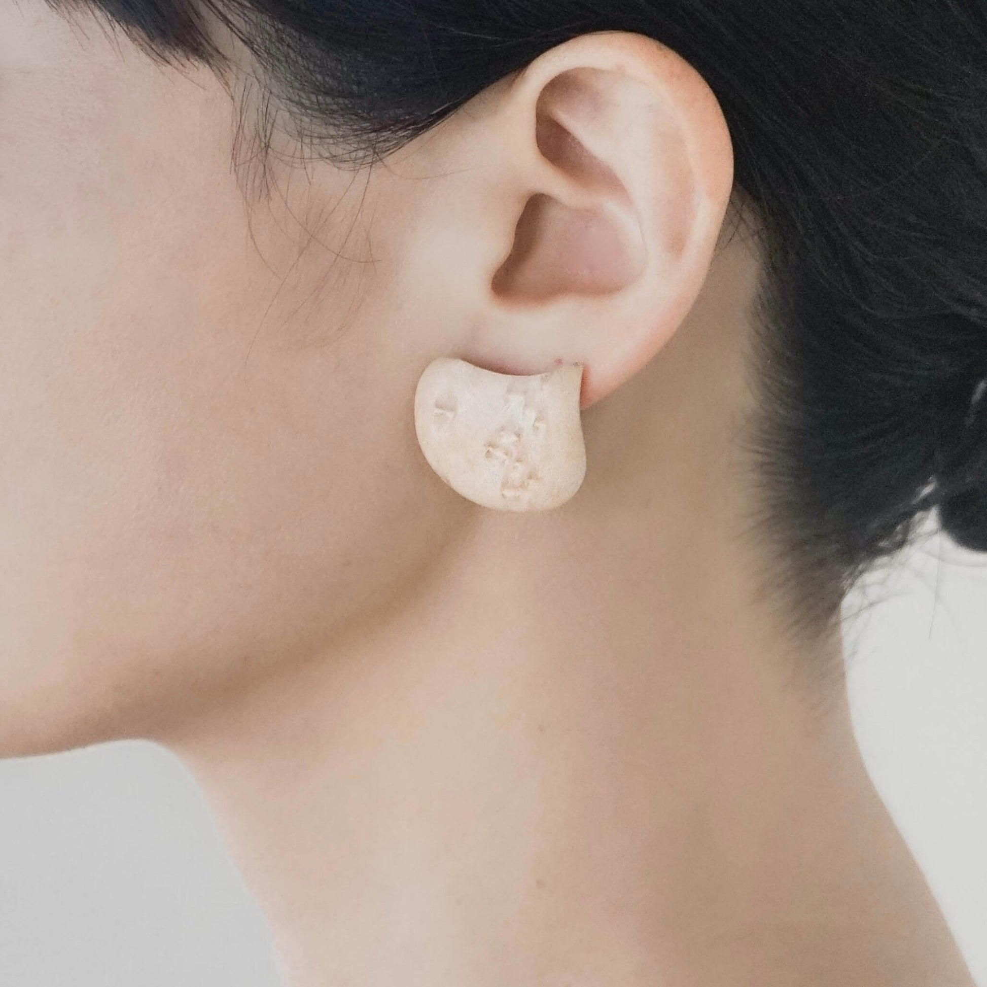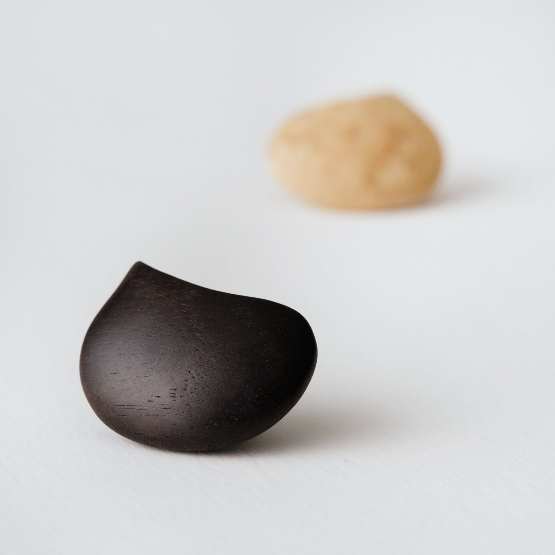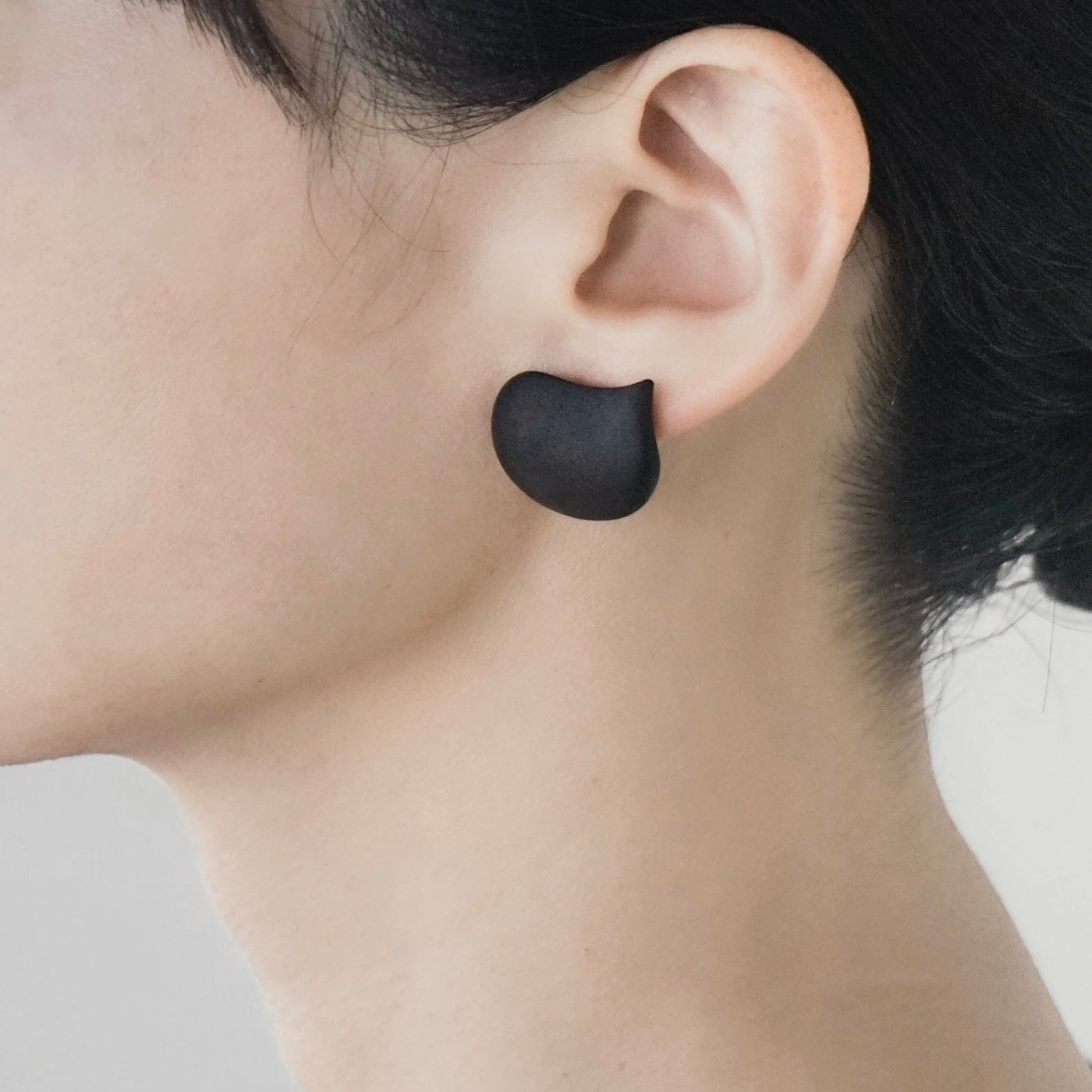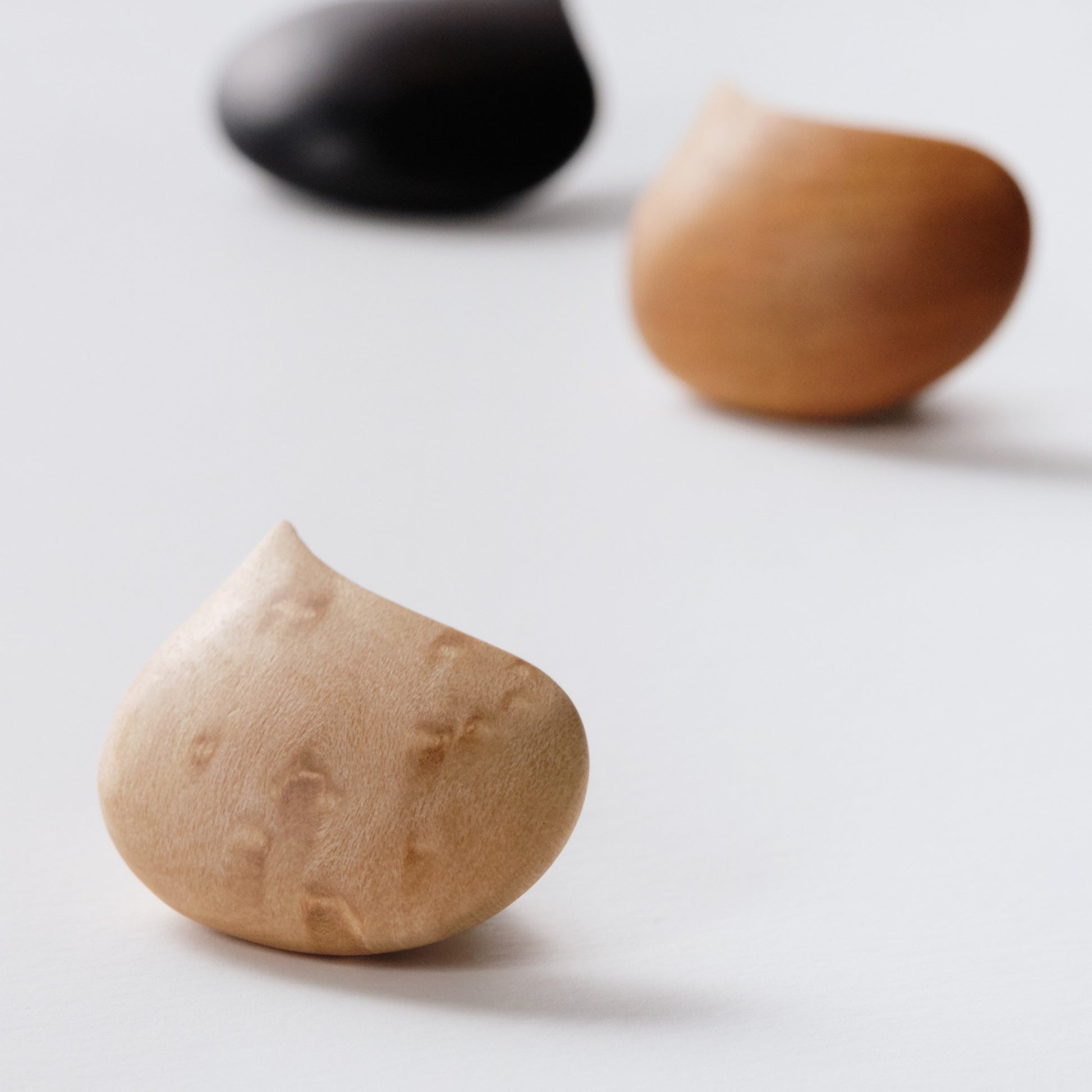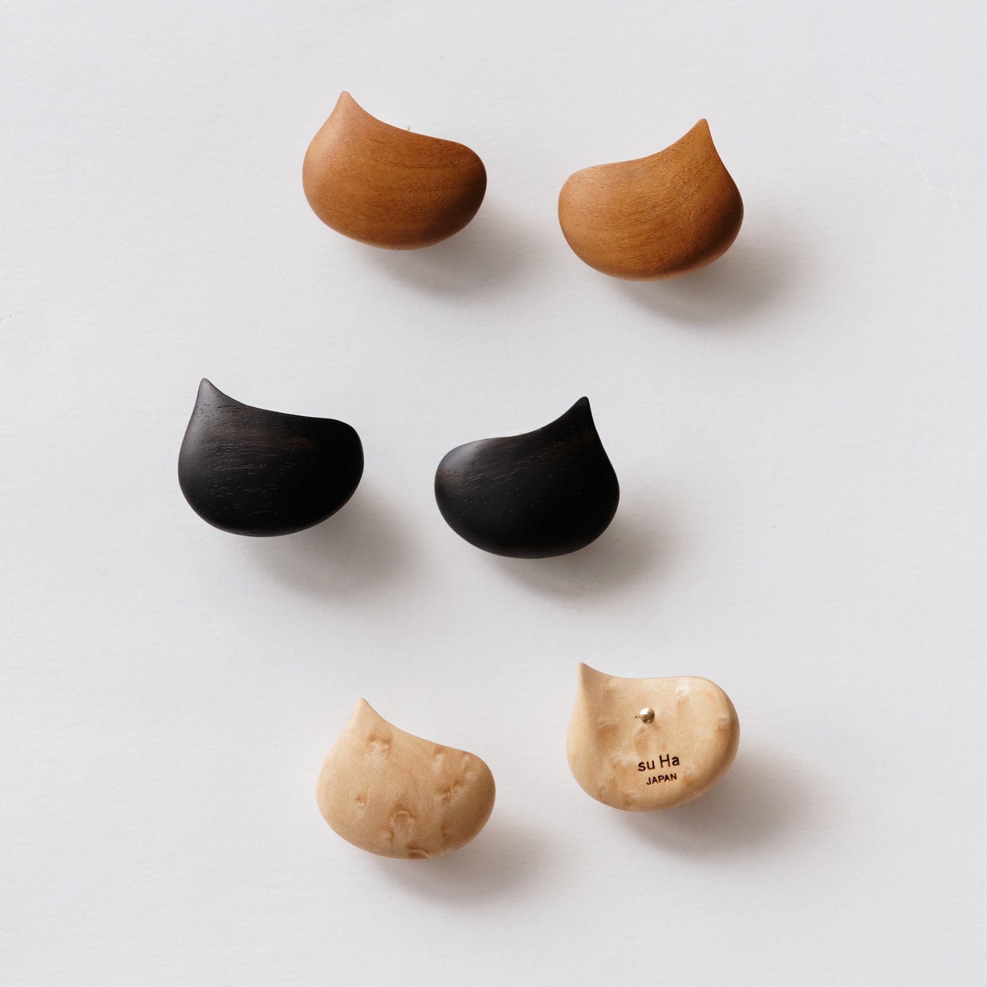 福耳をモチーフにした天然木のピアス。すべすべの木肌が耳たぶにふっくらとなじみます。石のような艶のある黒柿、肌に溶け込む色合いの楓(かえで)、経年変化により飴色へと深まるもみじばふう、3つの樹種を揃えました。