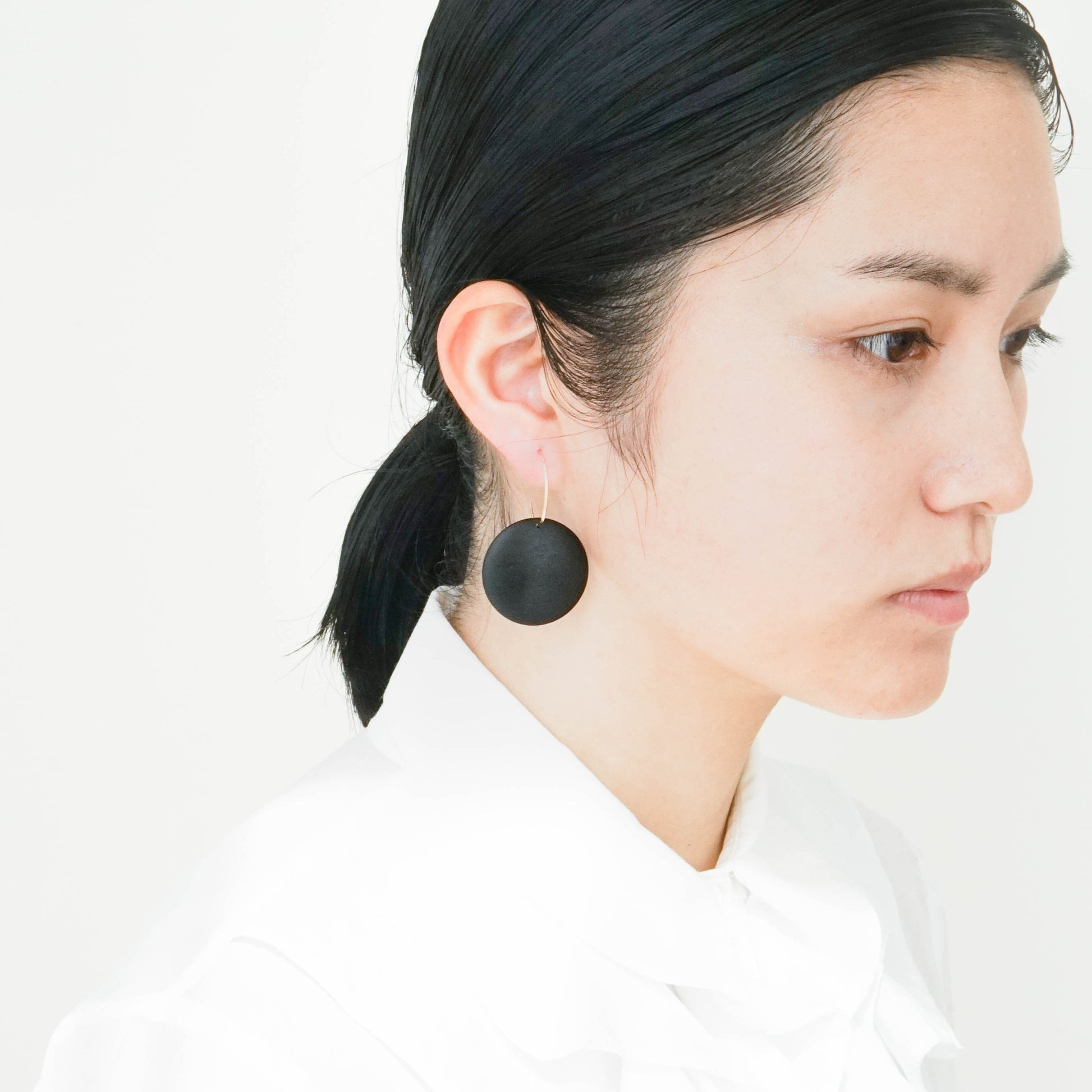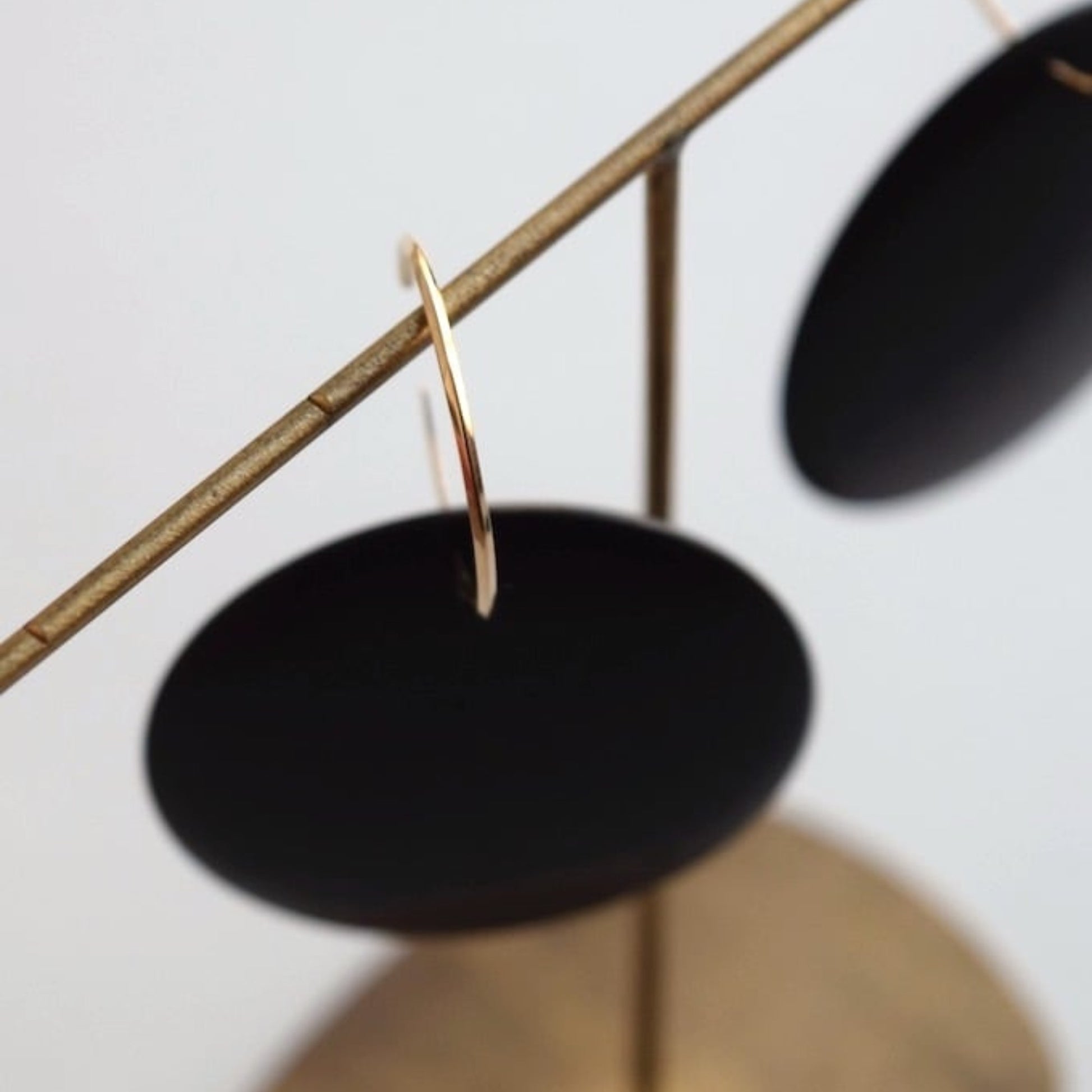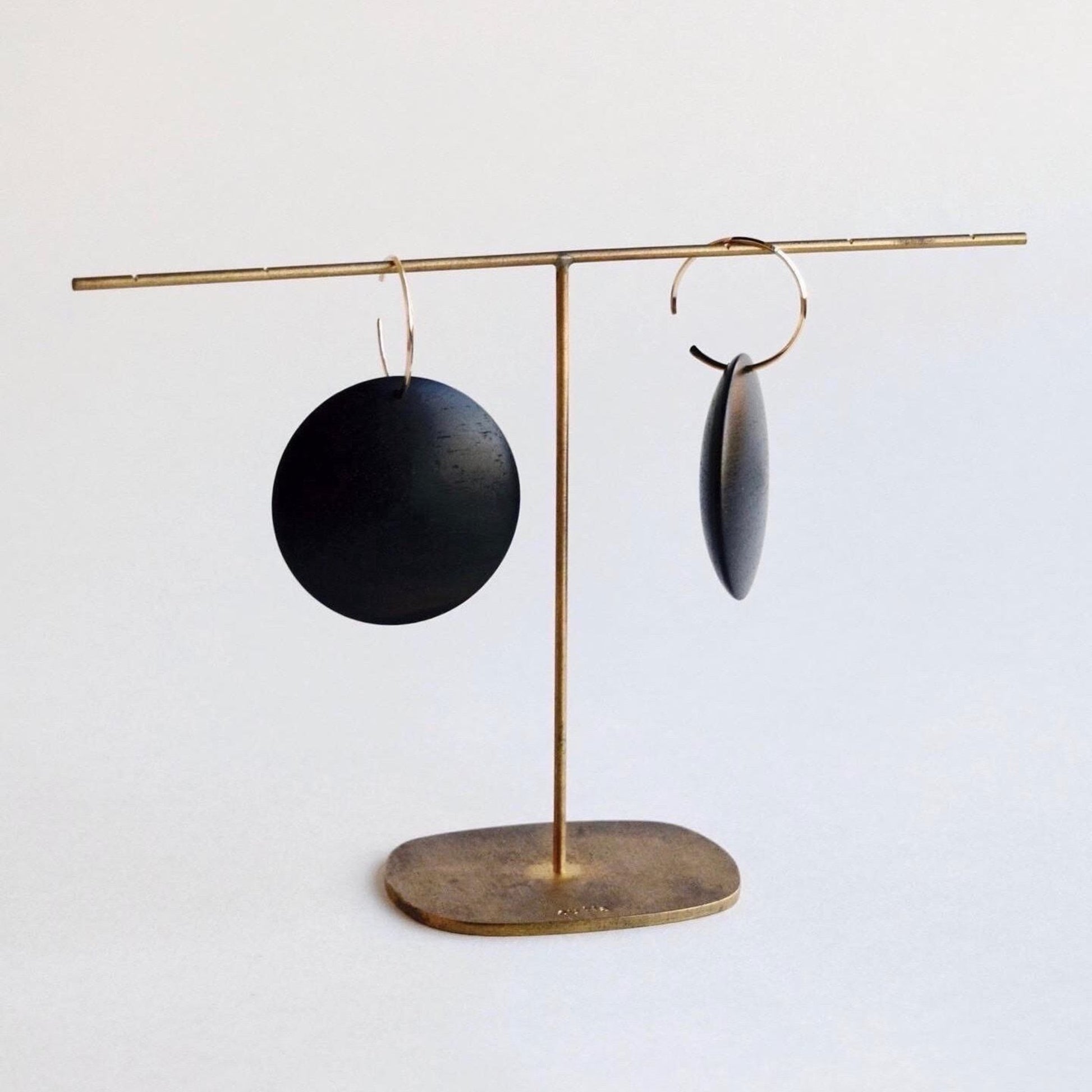 黒柿のシンプルなフープピアス。厚みを感じさせないひらりとした形は、薄く挽いた縁から中心に向かってなだらかに膨らみを持たせています。